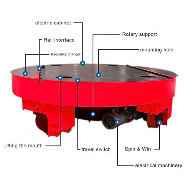 Turntable transport vehicle is a kind of equipment to realize the in-situ turning and reversing of track flat cars. It is installed at the intersection of two tracks. One or more tracks are laid on the platform. The upper surface of the track is flush with the upper surface of the track on the ground, and the gauge is consistent with the gauge of the ground. The flat car runs completely to the turntable and stops. The turntable starts to rotate to the required angle to complete the docking with the track on the ground, The flat car starts again and runs along the track after docking to the required position, which can realize stop at any angle of 360 degrees, and can also realize well type cross running. It is applicable to the annular track, cross track and other occasions of the equipment production line. The rotary table system operates stably, the track alignment accuracy is accurate, and full automatic electrical control can also be realized. The rotary table is arranged in a circular pit, and its surface is flush with the ground.